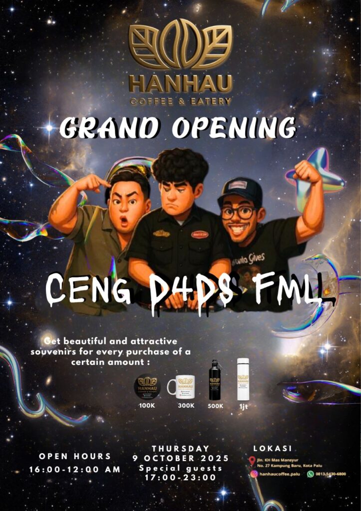 daikykota.com PALU – Pecinta kopi dan tempat nongkrong kece, catat tanggalnya! Besok, Kamis, 9 Oktober 2025, Hanhau Coffee Shop resmi grand opening mulai pukul 16.00 hingga 00.00 WITA di Jalan KH Mas Mansyur No. 27, Kelurahan Baru, Kota Palu.