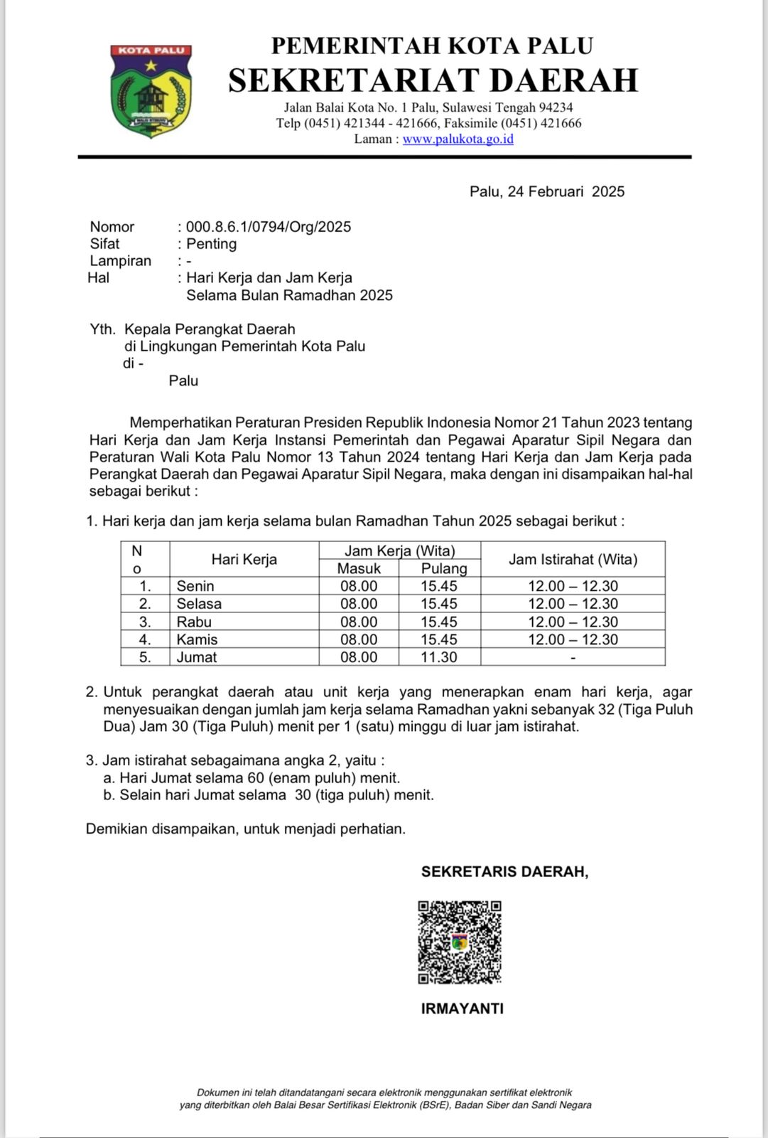 dailykota.com PALU – Pemerintah Kota Palu menetapkan jam kerja Aparatur Sipil Negara (ASN) selama Ramadhan 2025 melalui surat edaran Sekretaris Daerah Kota Palu, Irmayanti. Aturan ini mengacu pada Peraturan Presiden Nomor 21 Tahun 2023 dan Peraturan Wali Kota Palu Nomor 13 Tahun 2024, yang di kelurakan Senin, 24 Februari 2025.